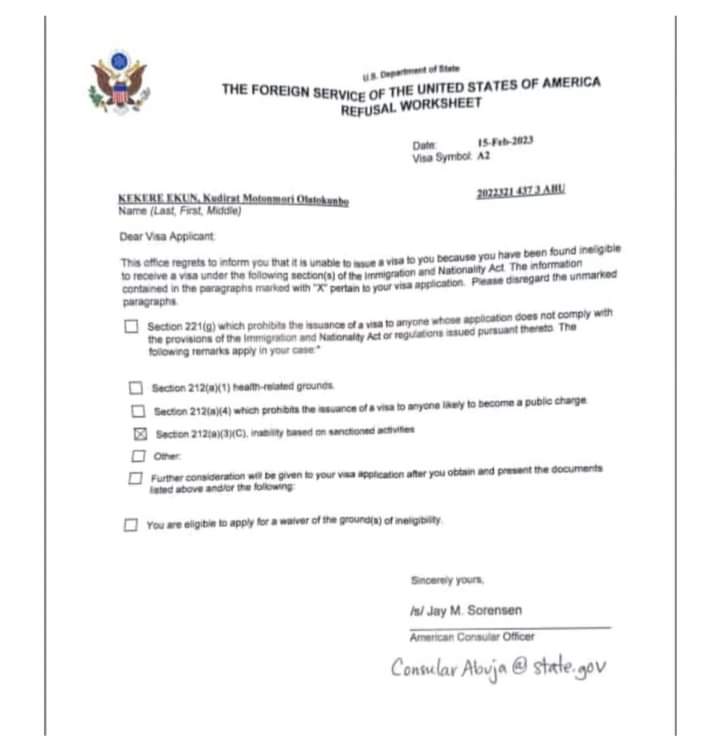 In a letter signed by Jay M. Sorensen, the American Consular Officer in Abuja, U.S. authorities stated that Justice Kekere-Ekun’s visa was denied due to “sanctioned activities.”