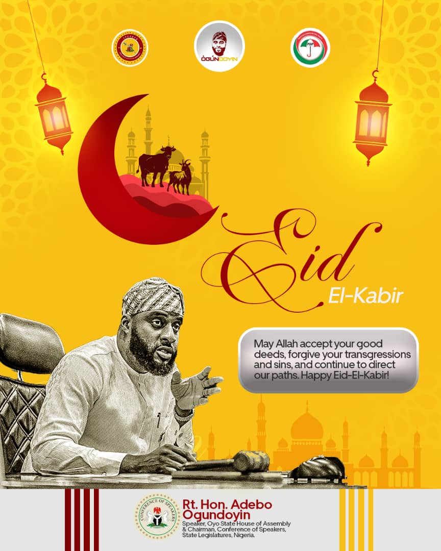 The Speaker of the Oyo State House of Assembly and Chairman of the Conference of Speakers of State Legislatures of Nigeria, Rt. Hon. Adebo Ogundoyin, has extended warm felicitations to millions of Muslims across Nigeria on the occasion of the 2025 Eid-el-Kabir celebration.