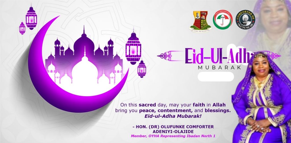 Honourable Comforter extends her warmest greetings and heartfelt congratulations to the Muslim Ummah in Nigeria, especially in Oyo State and Ibadan North, as well as Muslims around the world, on the occasion of Eid-el-Kabir.