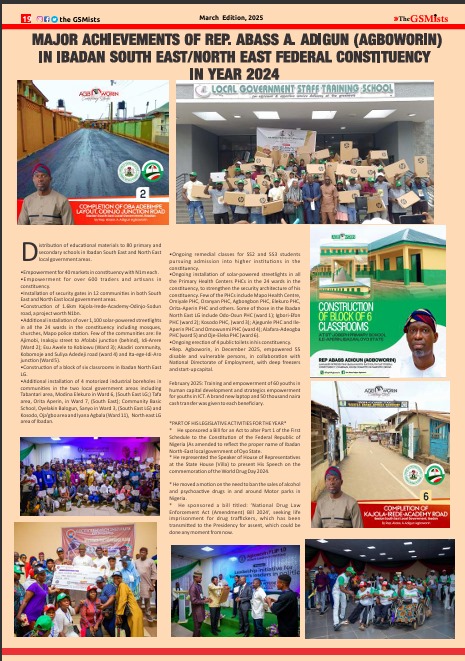 Agboworin’s initiatives since 2023 in the education sector have been particularly noteworthy. Some of his notable achievements include completion and commissioning of a block of 3 classrooms building equipped with chairs, tables, fans, and other facilities at St. Paul Anglican School, Yanbule (August 12, 2024); distribution of thousands of educational materials including school bags, notebooks, and textbooks to primary and junior secondary school students (February 20, 2024); construction of a block of six classrooms in St Joseph Primary School, Ile-Aperin, Ibadan North-East LG (November 24, 2024), and ongoing remedial classes for SS2 and SS3 students pursuing admission into higher institutions in the constituency.