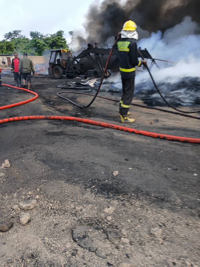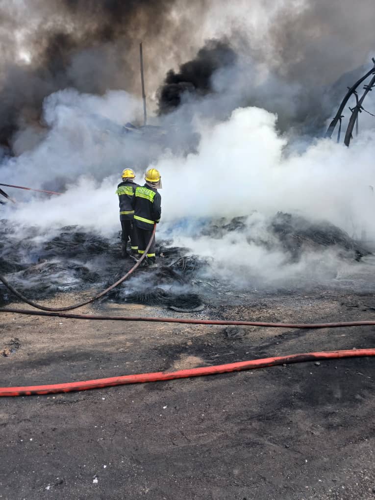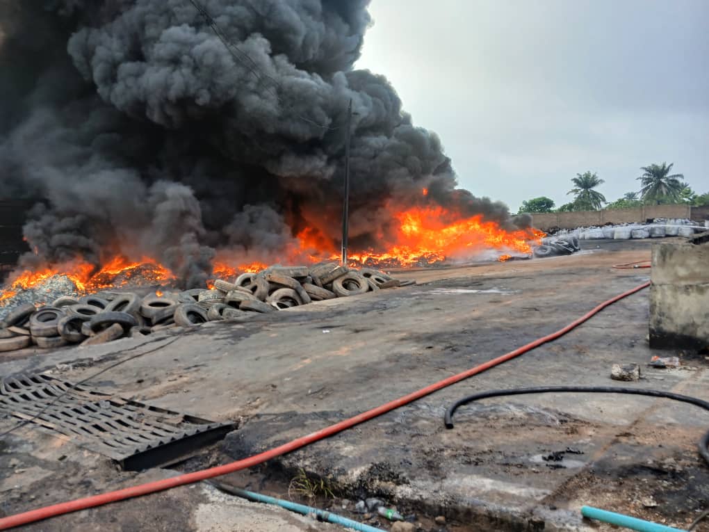 The Agency’s Officers, led by CFS Olubunmi Christy, swiftly deployed to the incident scene. On getting to the place, we met the disused tyres recycling section full of the accumulated disused tyres engulfed by fire.