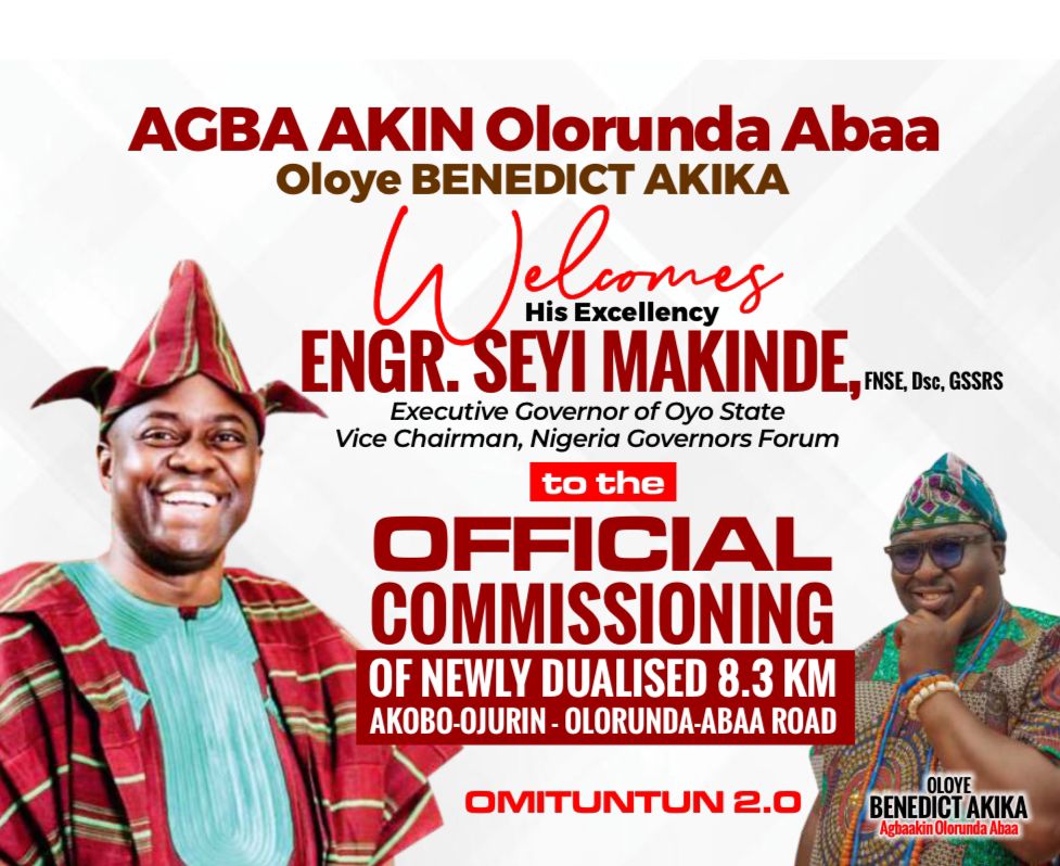 The Agbaakin of Olorunda-Abaa and the Omituntun Benedict Forum (OBF) have jointly extended heartfelt appreciation to the Executive Governor of Oyo State, His Excellency, Engr. Seyi Makinde FNSE, for the official commissioning of the newly dualised 5.9-kilometre Akobo Ojurin–Olorunda-Abaa–Eniosa Junction Road, a landmark project aimed at improving connectivity, safety, and development within the Lagelu Local Government Area.