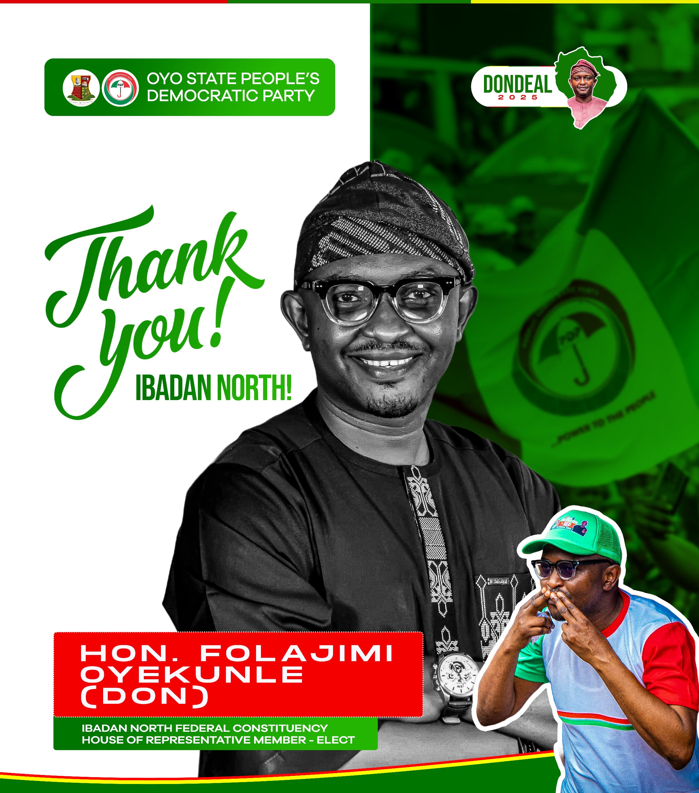 The newly elected House of Representatives member for Ibadan North Federal Constituency, Hon. Folajimi Oyekunle, popularly known as DoN, has described his victory at Saturday’s bye-election as a triumph of the people’s will and a clear mandate for progress.