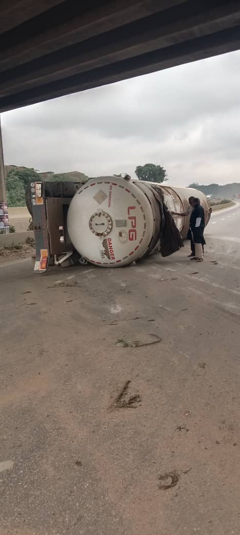 A Mack trailer tanker loaded with twenty-six (26) Tons capacity of Liquefied Petroleum Gas (LPG) has tumbled in Ibadan, Oyo State capital.