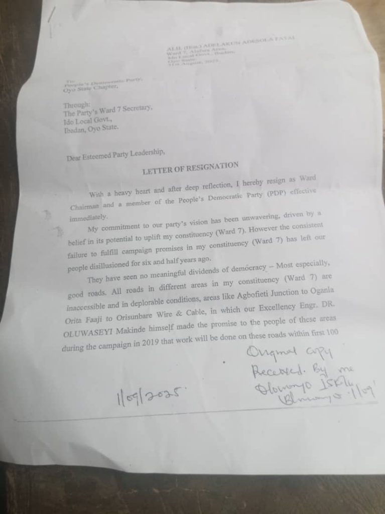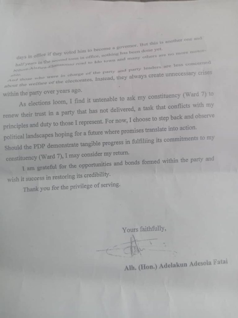 In a shocking development, Alhaji Adelakun Adesola Fatai, Chairman of the People’s Democratic Party (PDP) in Ward 07 of Ido Local Government Area of Oyo State, has announced his exit from the party.