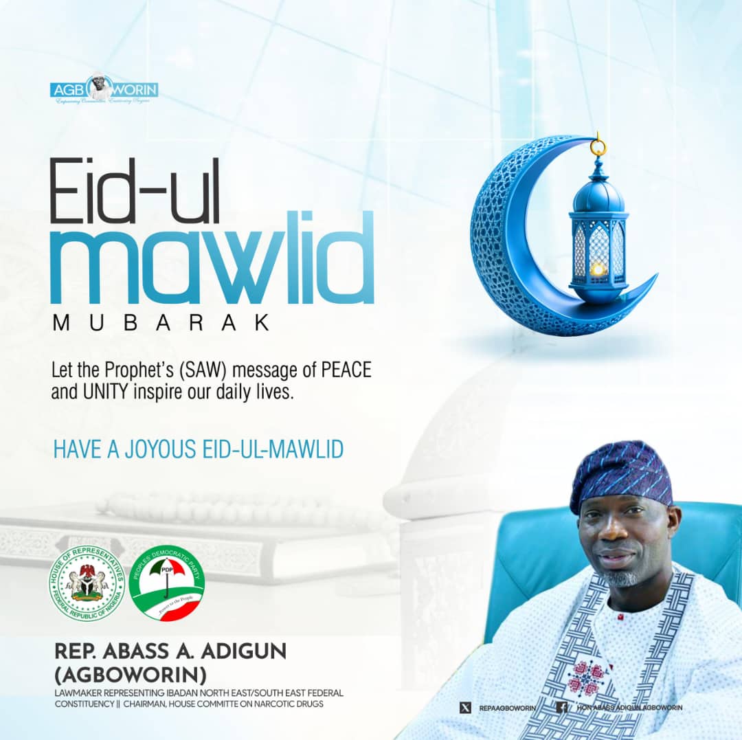 Lawmaker representing Ibadan North East/South East federal constituency of Oyo State, Rep. Abass Adigun (Agboworin), on Friday, congratulated the Muslim faithful in the state on the occasion of the celebration of the birth of the Holy Prophet Muhammad (peace be upon him) popularly known as the Eidul-Mawlid.
