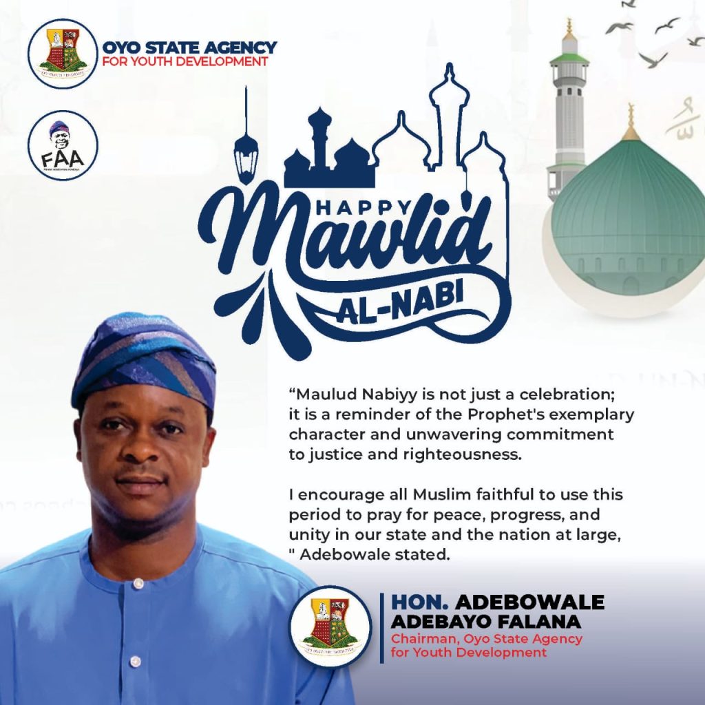 The Chairman of the Oyo State Agency for Youth Development, Hon. Adebowale Adebayo Falana, has extended warm greetings and felicitations to the Muslim faithful across the state and beyond on the occasion of Maulud Nabiyy, the commemoration of the birth of the Holy Prophet Muhammad (SAW).