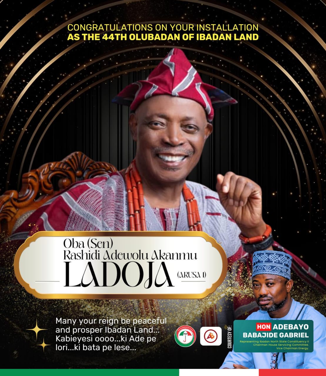 The lawmaker representing Ibadan North Constituency 2 in the Oyo State House of Assembly, Hon. Adebayo Babajide Gabriel, popularly known as the Jagaban of the 9th and 10th Assembly, has congratulated Oba Rashidi Adewolu Ladoja, Arusa 1, on his enthronement as the 44th Olubadan of Ibadanland.