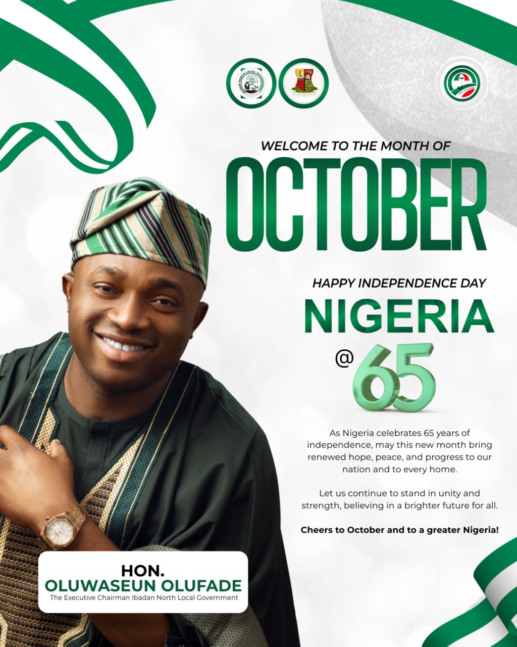 As Nigeria marks yet another milestone in her history, the Executive Chairman of Ibadan North Local Government, Hon. Oluwaseun Olufade, has joined millions of citizens across the country and the world to celebrate the nation’s Independence Anniversary.