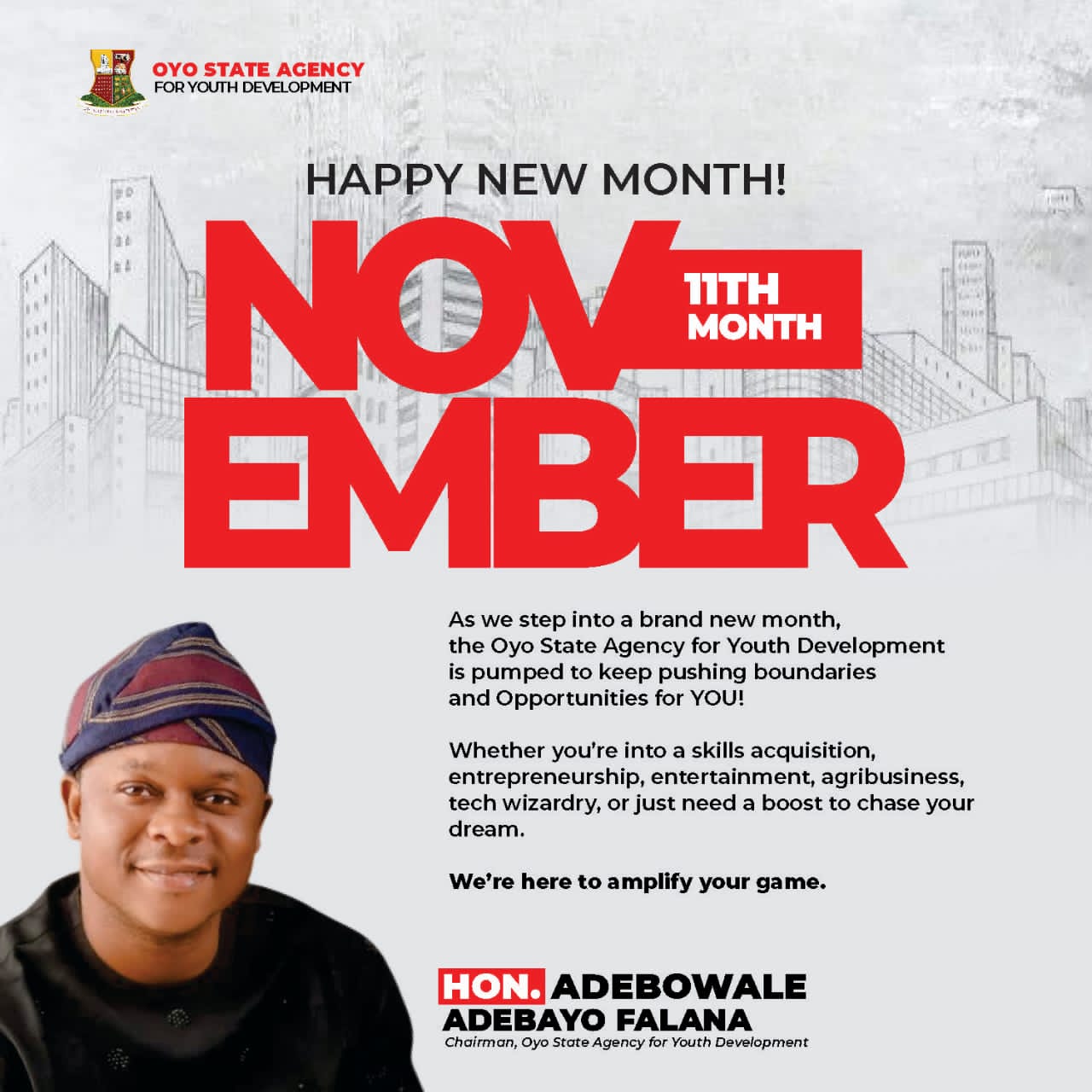 In his message to mark the start of November, made available to newsmen by the Head of Media Unit to the Chairman Opeyemi Rasheed Socrates, the Chairman of the Agency, Hon. Adebowale Falana, expressed optimism about the month ahead, noting that the agency remains committed to unlocking the potential of Oyo youths in diverse sectors, including skills acquisition, entrepreneurship, entertainment, agribusiness, and technology.
