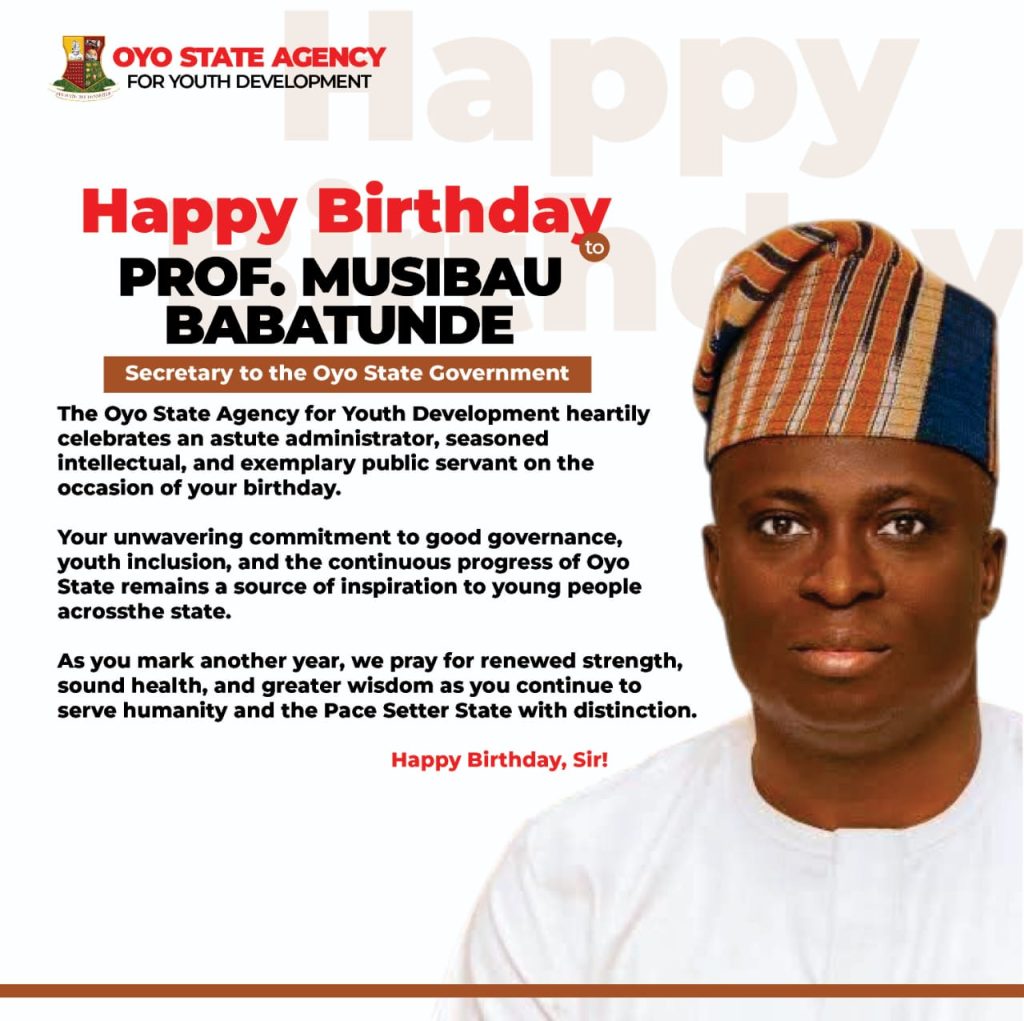 Hon. Adebowale Adebayo Falana, the Chairman of the Oyo State Agency for Youth Development has extended warm felicitations to the Secretary to the Oyo State Government, Prof. Musibau Babatunde Adetunji, on the occasion of his birthday, describing him as an exceptional administrator and a distinguished public servant.