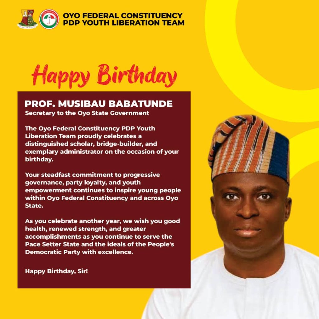 The Oyo Federal Constituency chapter of the People’s Democratic Party (PDP) Youth Liberation Team has congratulated the newly appointed Secretary to the Oyo State Government, Prof. Musibau Babatunde, on the occasion of his birthday.