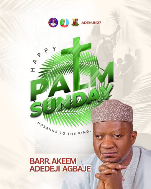 Barr. Akeem Adedeji Agbaje, a chieftain of the All Progressives Congress (APC) and 2027 gubernatorial aspirant in Oyo State, has extended warm greetings to Christians in Oyo State and across Nigeria on the occasion of Palm Sunday.