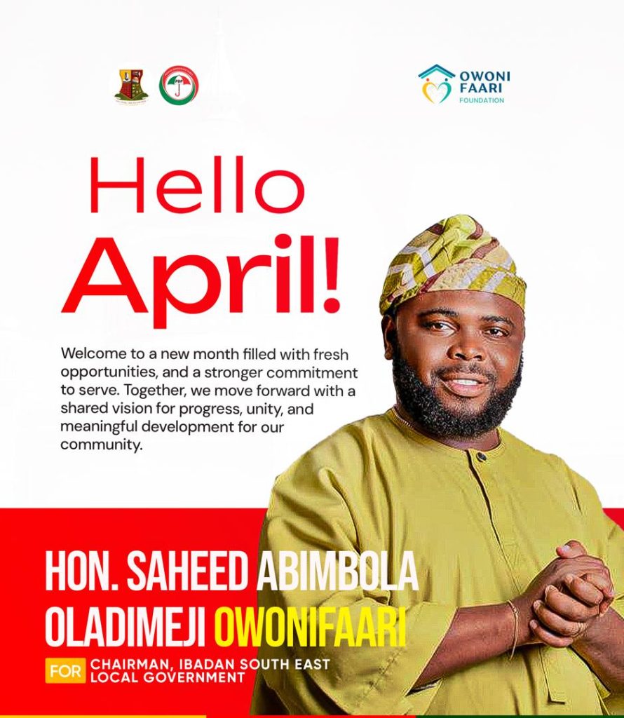 Hon. Saheed Abimbola Oladimeji, popularly known as Owonifaari, has extended warm greetings to residents of Ibadan South-East Local Government Area as they usher in the new month of April.