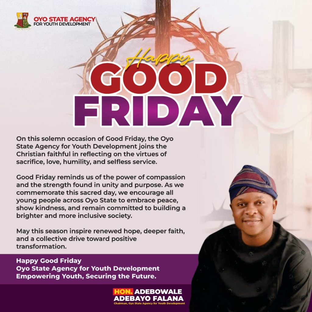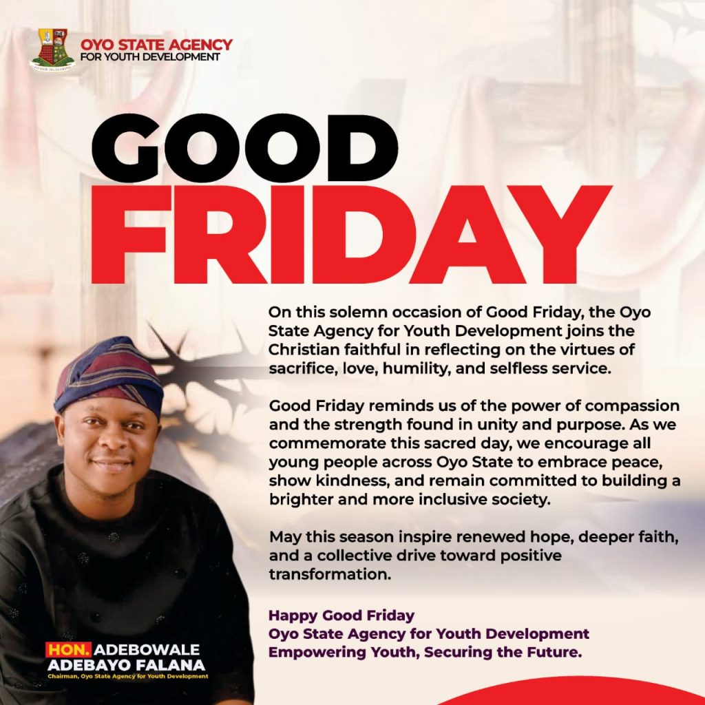 The Oyo State Agency for Youth Development, under the leadership of Hon. Adebowale Adebayo Falana, has extended warm felicitations to Christians across the state and beyond on the occasion of Good Friday, urging them to reflect deeply on the enduring virtues of sacrifice, love, and humility.