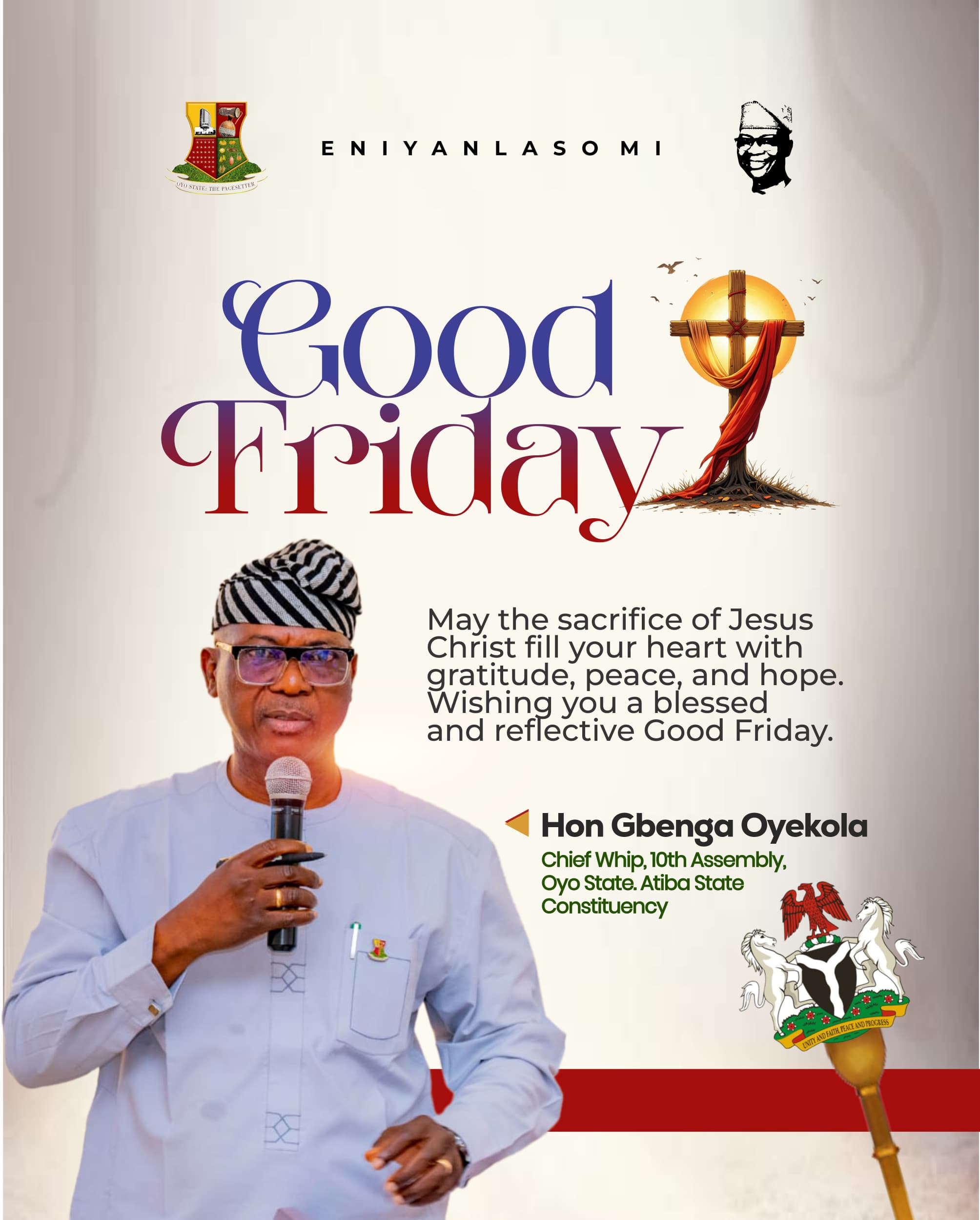 The Chief Whip of the Oyo State House of Assembly, Hon. Gbenga Joseph Oyekola, has extended warm felicitations to Christian faithful across his constituency and beyond on the occasion of Good Friday.