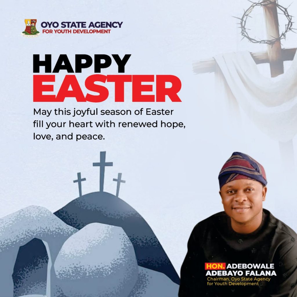 The Oyo State Agency for Youth Development, under the leadership of Hon. Adebowale Adebayo Falana, has extended warm Easter greetings to Christian faithful across the state, urging them to embrace the spirit of sober reflection in line with the significance of the season.