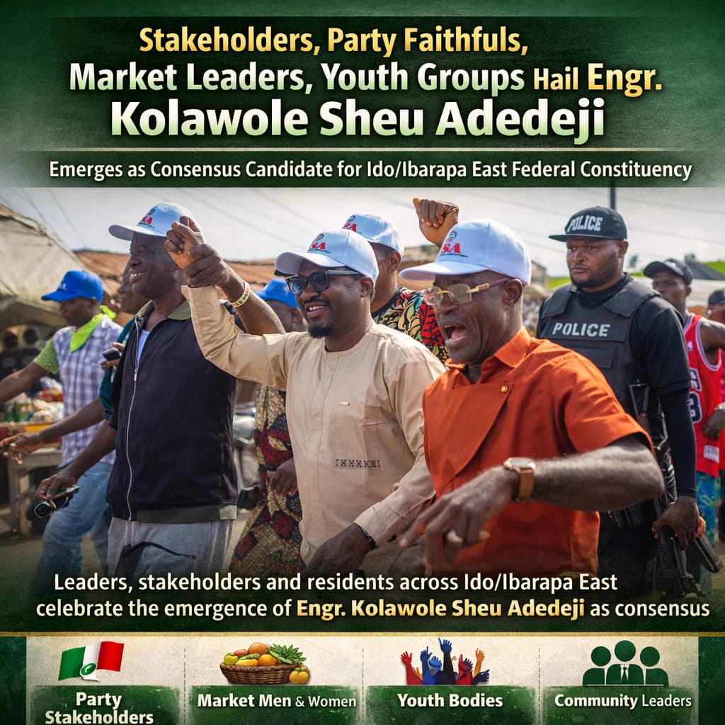 Stakeholders, party faithfuls, market leaders, youth bodies, and various community-based organizations across Ido and Ibarapa East Local Government Areas have expressed overwhelming support and commendation following the emergence of Engr. Kolawole Sheu Adedeji as the consensus candidate for the Ido/Ibarapa East Federal Constituency.
